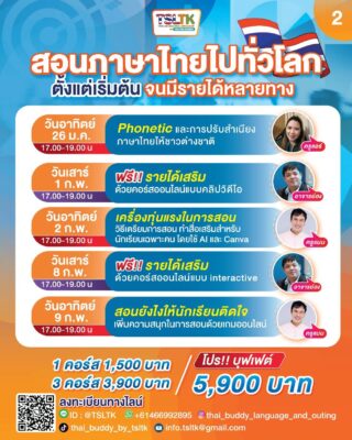 ในวันที่ 11 ม.ค. – 9 ก.พ. 2025 (เฉพาะวันเสาร์-อาทิตย์) ทาง TSLTK กำลังจะจัดอบรมครูสอนภาษาไทยให้ชาวต่างชาติอีกครั้งภายใต้คอนเซป “สอนภาษาไทยไปทั่วโลก ตั้งแต่เริ่มต้น จนมีรายได้หลายทาง” โดยแบ่งเป็นหัวข้อย่อยทั้งหมด 10 หัวข้อ แต่ละหัวข้อครูตุลได้เชิญวิทยากรระดับแนวหน้าของวงการมาเป็นคนให้ความรู้ ได้แก่