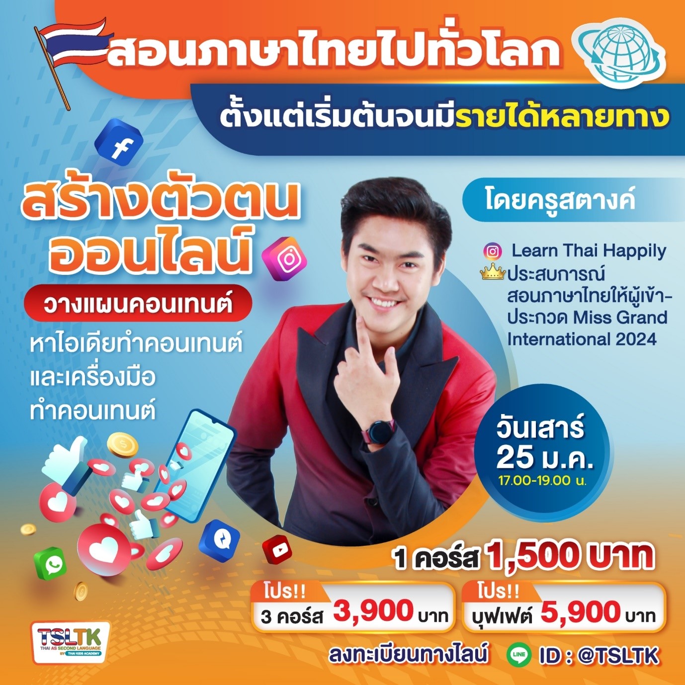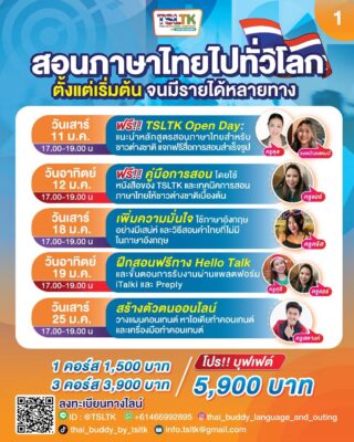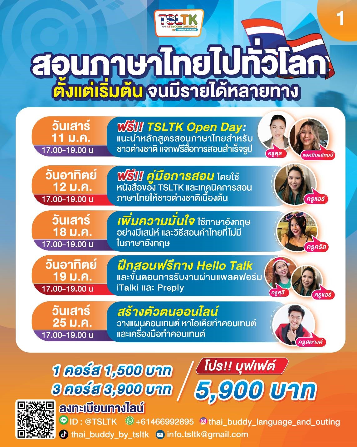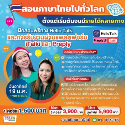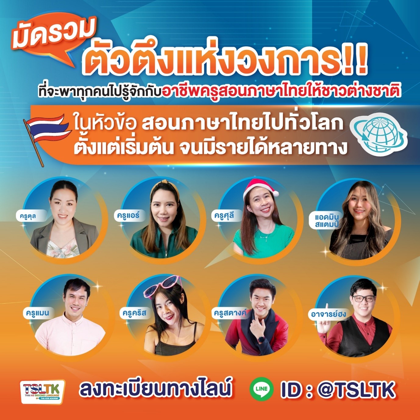 ในวันที่ 11 ม.ค. – 9 ก.พ. 2025 (เฉพาะวันเสาร์-อาทิตย์) ทาง TSLTK กำลังจะจัดอบรมครูสอนภาษาไทยให้ชาวต่างชาติอีกครั้งภายใต้คอนเซป “สอนภาษาไทยไปทั่วโลก ตั้งแต่เริ่มต้น จนมีรายได้หลายทาง” โดยแบ่งเป็นหัวข้อย่อยทั้งหมด 10 หัวข้อ แต่ละหัวข้อครูตุลได้เชิญวิทยากรระดับแนวหน้าของวงการมาเป็นคนให้ความรู้ ได้แก่