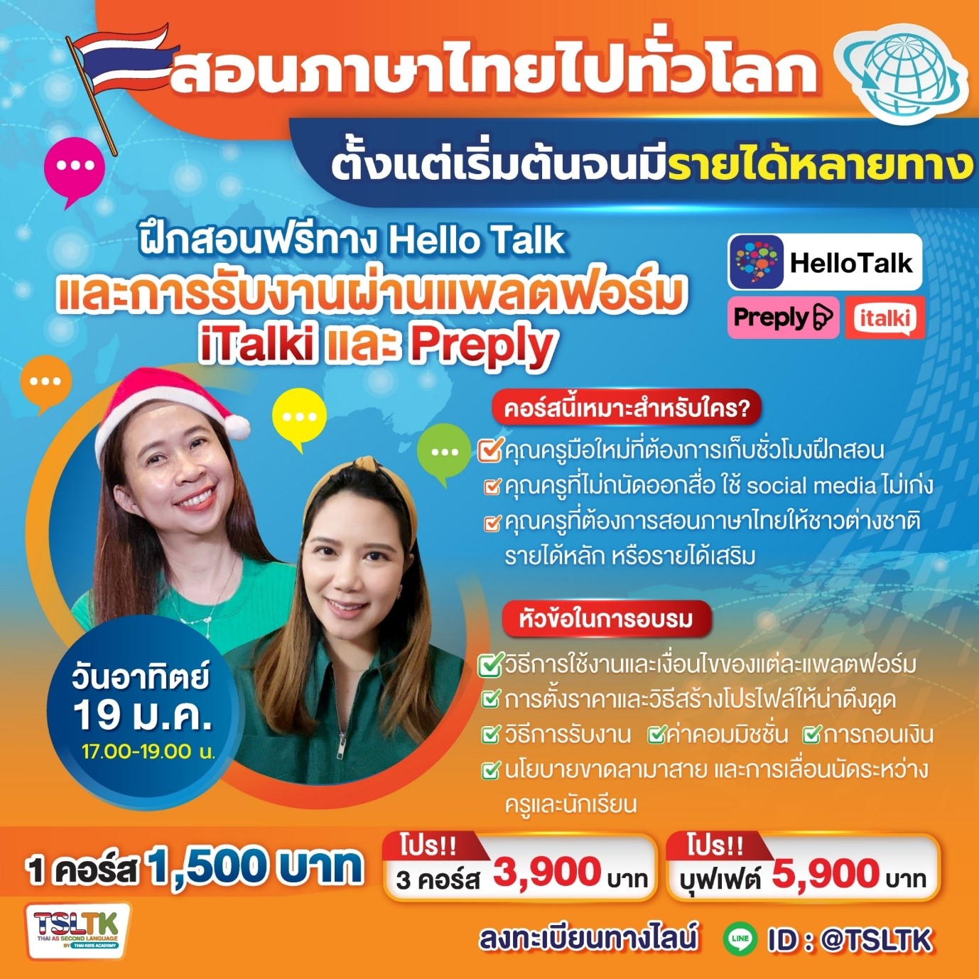 - ฝึกสอนฟรีทาง Hello Talk และขั้นตอนการรับงานผ่านแพลตฟอร์ม iTalki และ Preply โดย ครูศุลี (เพจ Sulee Thai) ครูแอร์ (เพจ Learn Thai with Air)